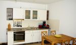 Im integrierten Küchenbereich befinden sich u. a. ein Herd mit 4 Ceranfeld-Kochplatten, ein Ofen, ein Kühlschrank, eine Kaffeemaschine und ein Wasserkocher.