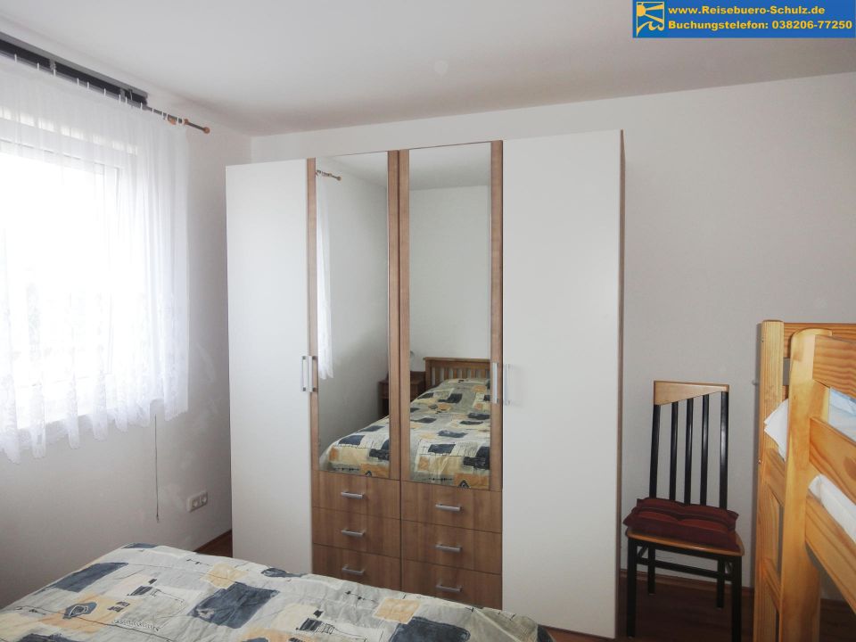 Im Schlafzimmer stehen ein Doppelbett (90 cm x 200 cm), ein Etagenbett (je 90 cm x 200 cm) sowie ein Kleiderschrank.