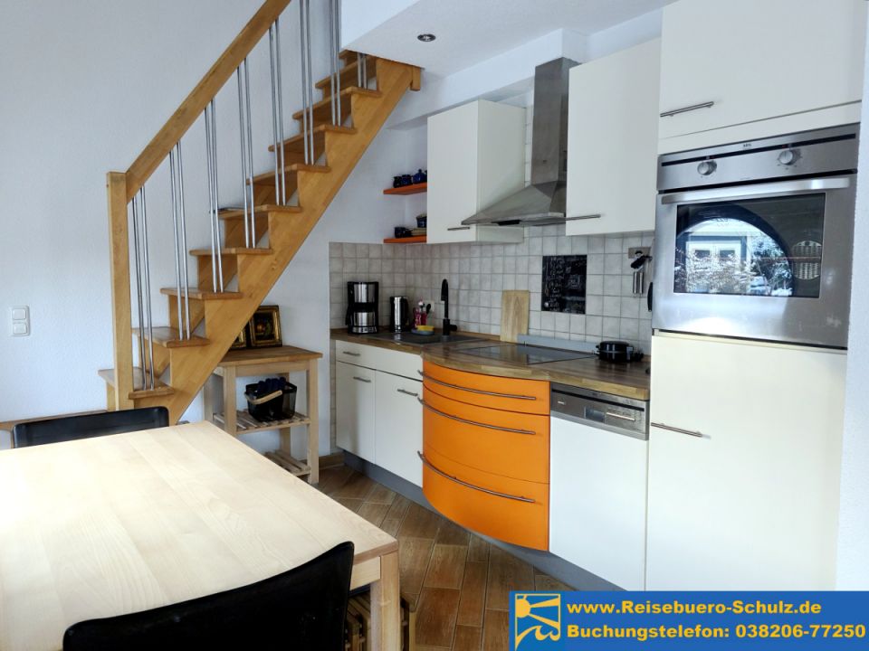 Die offene Küche ist in das Wohnzimmer integriert und u.a. mit einem Ceranfeld (4 Kochfelder), einem Backofen, einem Kühlschrank mit Gefrierfach, einem Geschirrspüler, einem Wasserkocher und einer Kaffeemaschine ausgestattet. Zu dem offenen Küchenbereich gehört ein großer Tisch mit einer Holzbank und Stühlen.