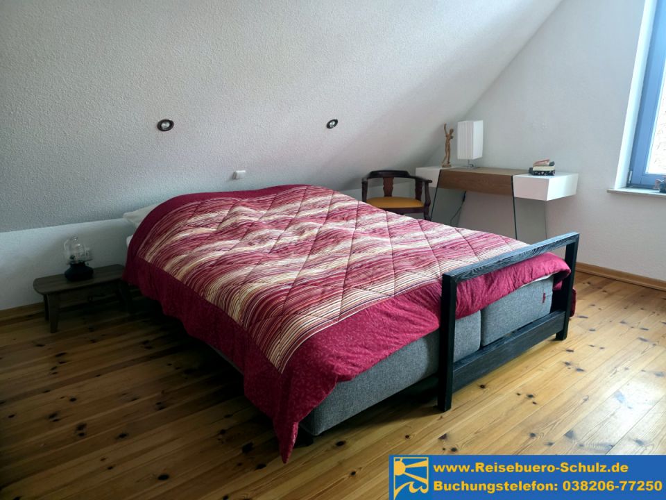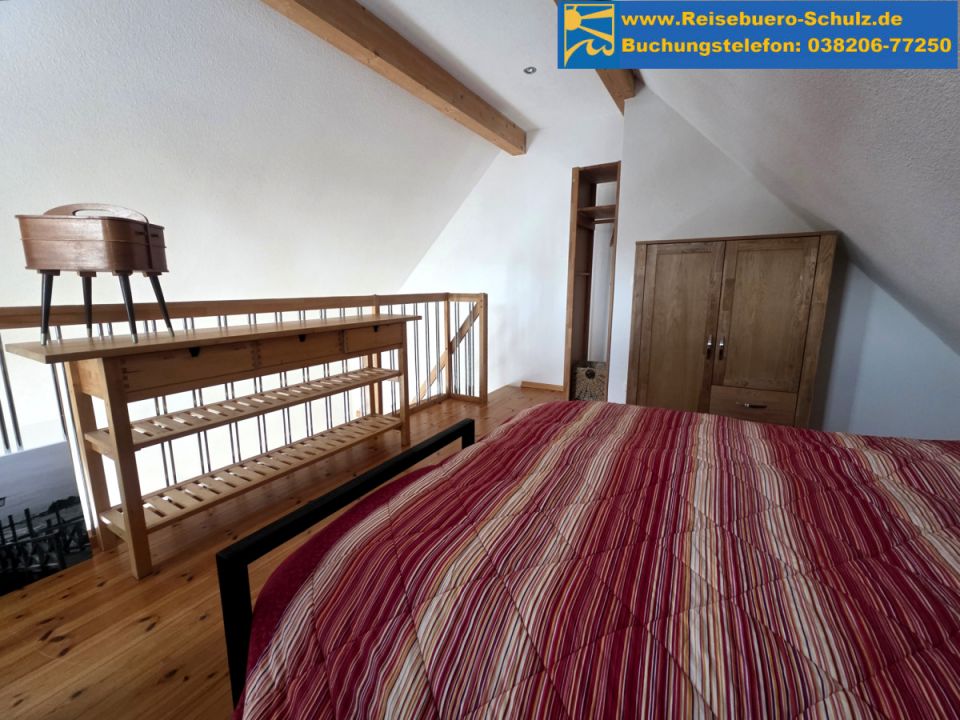Ein Schlafzimmer mit Doppelbett befindet sich in der offenen Galerie. Ein weiteres kleines Schlafzimmer mit zwei Einzelbetten (stapelbar) und einem Schrank befindet sich im Erdgeschoss.