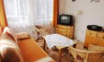 Im Wohnzimmer befinden sich eine Couch sowie eine kleine Flachstrecke mit einem Fernseher.