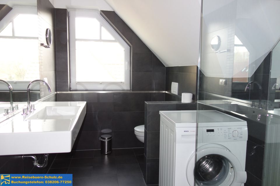 Im modernen Bad mit Fenster sind eine bodengleiche Dusche, ein WC, ein Waschbecken und eine Waschmaschine.