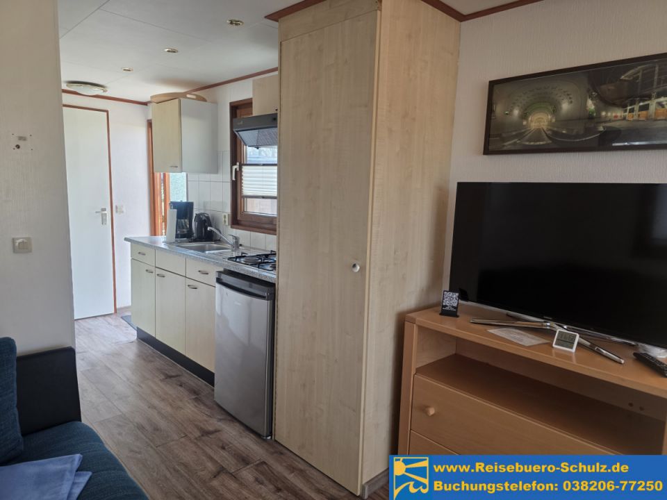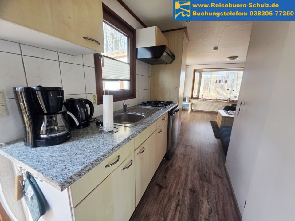 Die Küchenzeile verfügt unter anderem über einen Kühlschrank, vier Kochstellen (Gas), eine Kaffeemaschine sowie einen Wasserkocher und bietet damit alles für die Selbstversorgung während Ihres Aufenthaltes.