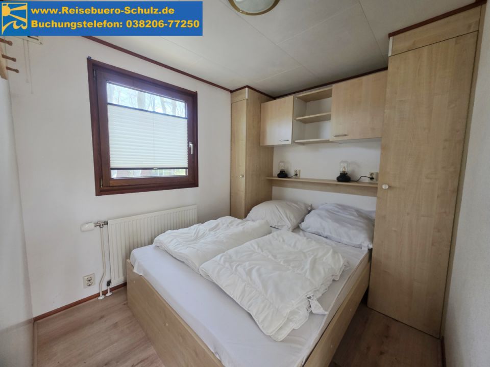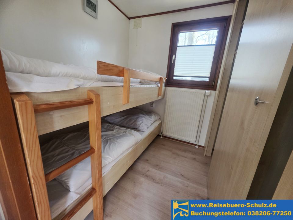 In einem Schlafzimmer befindet sich ein Doppelbett (140x200cm). Das zweite Schlafzimmer ist mit einem Etagenbett eingerichtet (je ca. 70x190 cm) und eignet sich ideal für Kinder. Der Abstand vom unteren zum oberen Etagenbett ist gering.